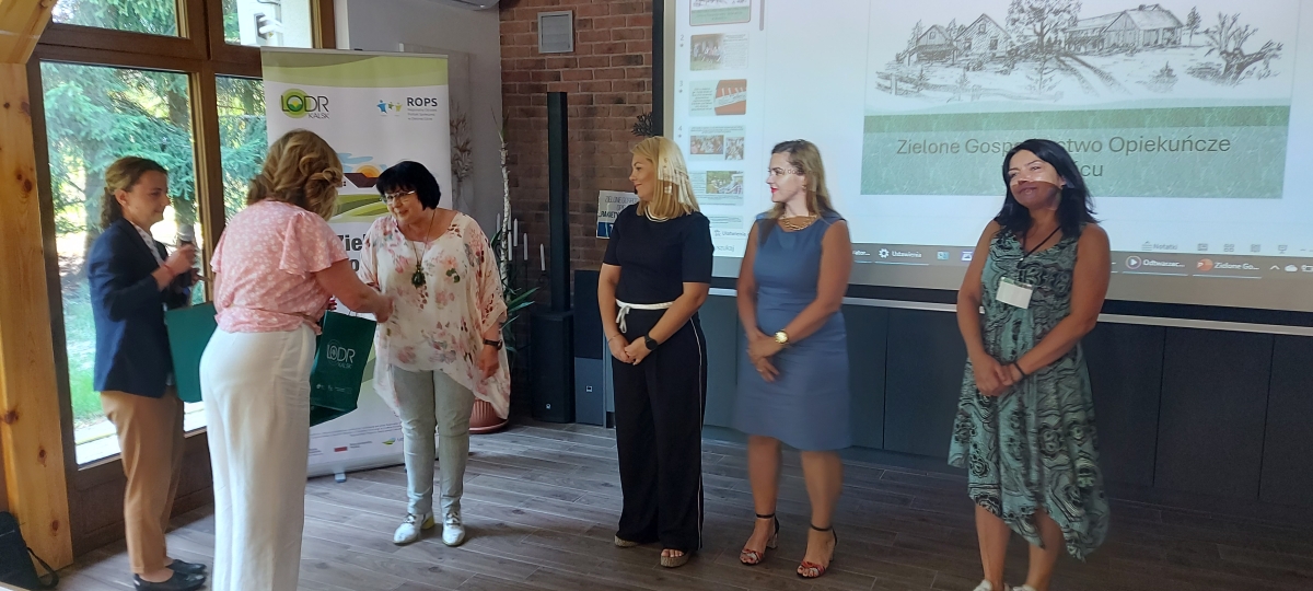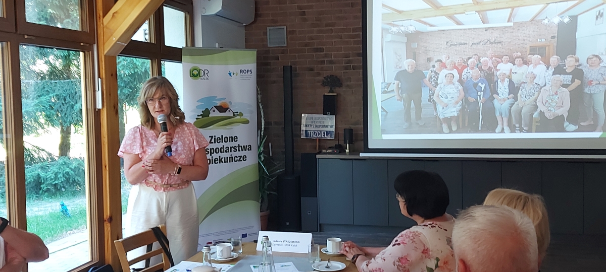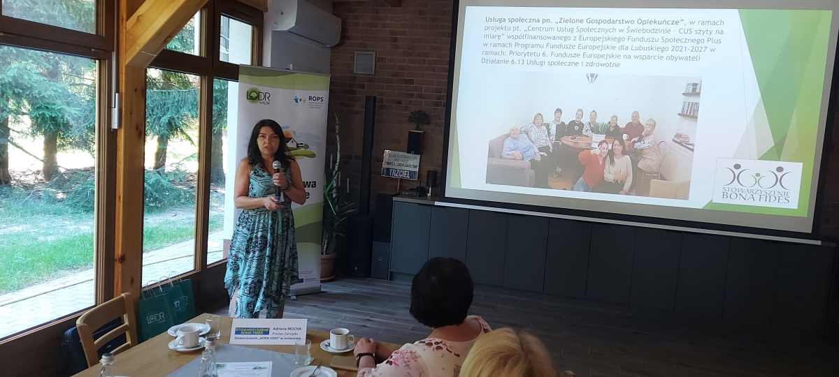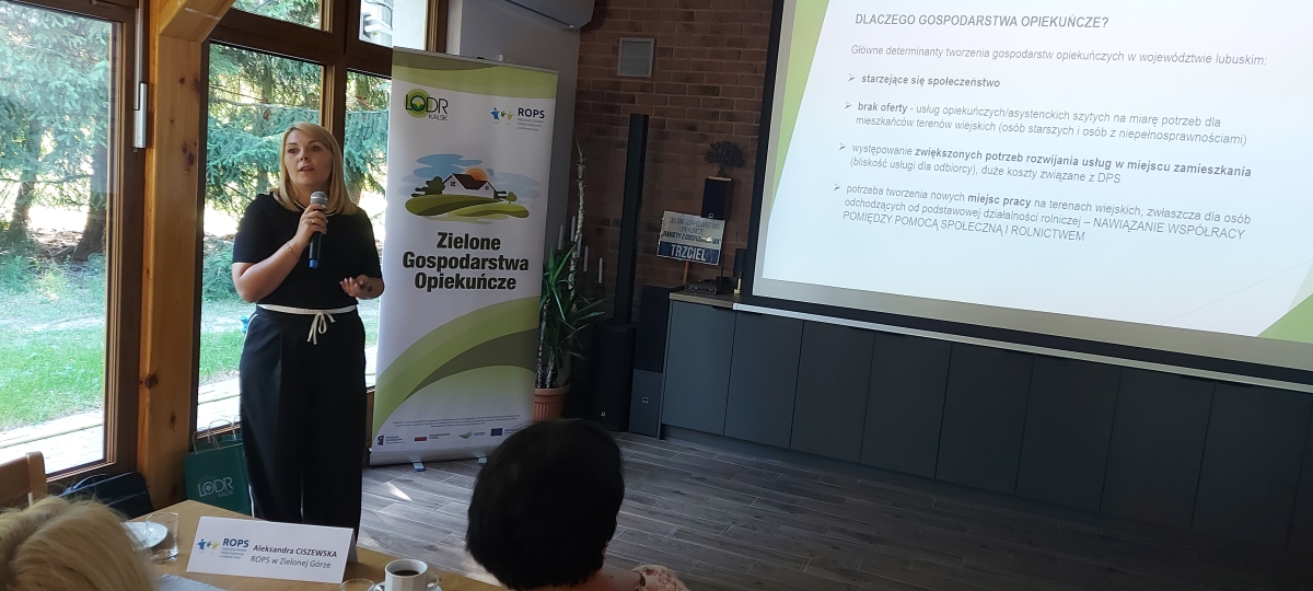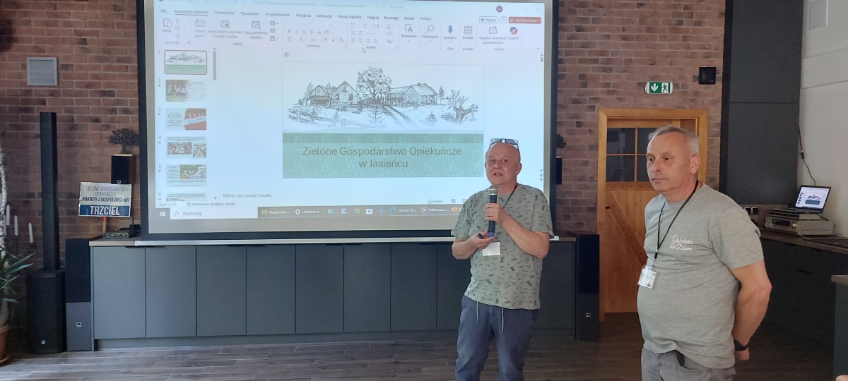 Aktualnie z projektem związane są trzy gospodarstwa: w Jasieńcu, Nowym Żabnie (dwie lokalizacje) i Witosławiu, których przedstawiciele uczestniczyli w wyjeździe. Ponadto w wizytacji udział wzięli przedstawiciele LODR, Urzędu Marszałkowskiego, LGD, ROPS oraz organizacje i stowarzyszenia społeczne. Obecność tak wielu stron związanych z gospodarstwami opiekuńczymi pozwoliła na lepsze poznanie tematyki i wymianę doświadczeń na rzecz rozwoju gospodarstw opiekuńczych w województwie lubuskim. Przedstawiciele poszczególnych jednostek zaprezentowali podczas spotkania w lubuskim gospodarstwie opiekuńczym „Gościniec Pod Dębem” w Jasieńcu, prelekcje ukazujące ważną rolę gospodarstw opiekuńczych w rozwoju lokalnym i wsparciu osób zagrożonych wykluczeniem społecznym. Jedną z prelegentek była Izabela Kumor-Pilarczyk, Dyrektor Departamentu PROW Urzędu Marszałkowskiego w Zielonej Górze. Przedstawiła różne inicjatywy zielonych gospodarstw opiekuńczych w województwie lubuskim. Aleksandra Ciszewska z ROPS Zielona Góra poruszyła tematykę lubuskiego modelu usług społecznych na terenach wiejskich. Swoim doświadczeniem podzieliła się również Roksana Górna-Kopij z LGD Stowarzyszenie Kraina Lasów i Jezior wraz z przedstawicielami funkcjonującego gospodarstwa opiekuńczego Dariuszem i Marią Miśkiewicz z Nowego Żabna oraz Adrianną Muchą ze Stowarzyszenia „Bona Fides” w Jordanowie. Zwieńczeniem spotkania było wystąpienie gospodarzy - Grzegorza Fajkisa i Janusza Frączaka oraz rozmowa z seniorami dająca poczucie nieocenionej wartości takich inicjatyw.